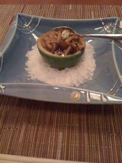 Depois, veio um Nametaki no dashi servido no limão, um cogumelo que parecia um shimeji, com gosto mais forte. A dica era pegar gominhos do limão com a colherinha para comer junto.